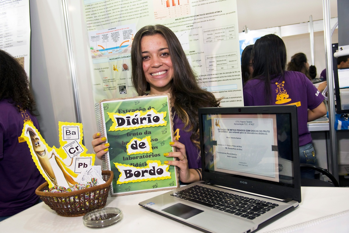 Crédito: Gastão Guedes | Isabella Santos, da Etec Raposo Tavares, foi um dos destaques da 14ª Febrace com o projeto Extração de metais pesados com cascas do fruto da banana: uso voltado aos laboratórios didáticos