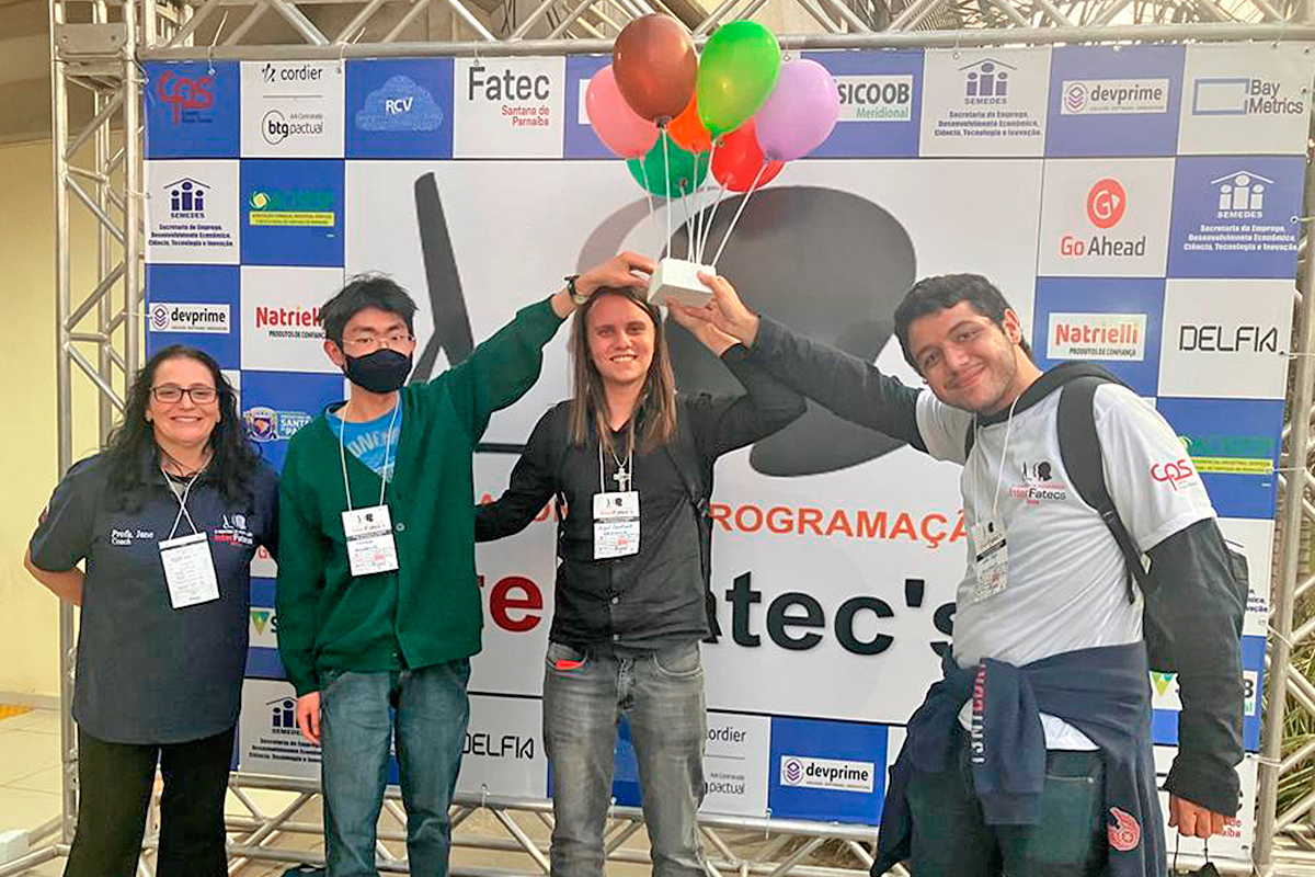 Equipe da Fatec Guarulhos que venceu a última edição do evento: a partir da esquerda, a orientadora Jane Eberson, e os estudantes Fernando Tomita, Miguel Cavalcante Filho e Vitor Santos l Foto: Divulgação