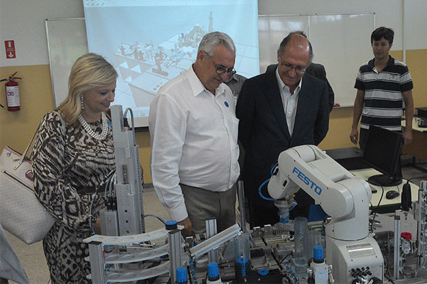 Crédito: Divulgação | Geraldo Alckmin visita Laboratório de Produção Industrial, acompanhado de Laura Laganá e de Roberto Colenci, diretor da Fatec Botucatu