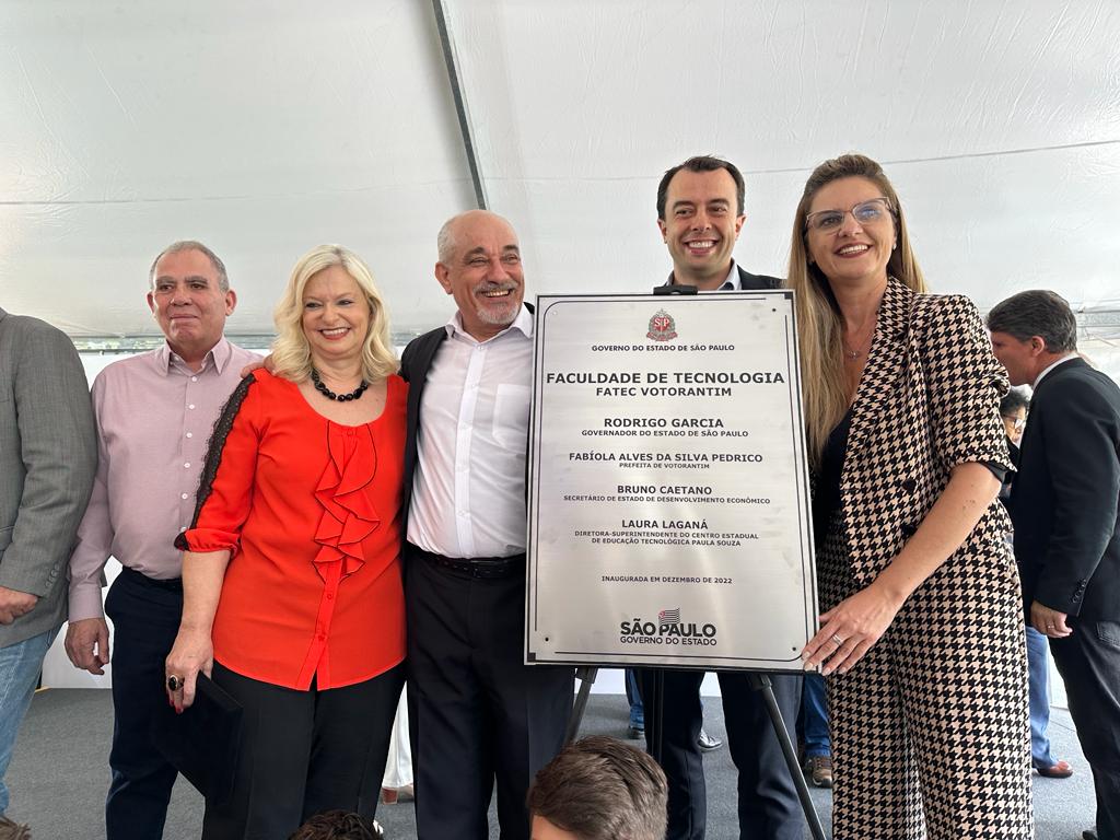 Nesta terça-feira (13), o secretário de Desenvolvimento Econômico, Bruno Caetano, representou o governador Rodrigo Garcia na cerimônia de inauguração da sede da futura Faculdade de Tecnologia do Estado (Fatec) Votorantim, na Região de Sorocaba. A prefeita do município, Fabíola Alves da Silva Pedrico, e a diretora-superintendente do Centro Paula Souza (CPS), Laura Laganá, participaram do evento.