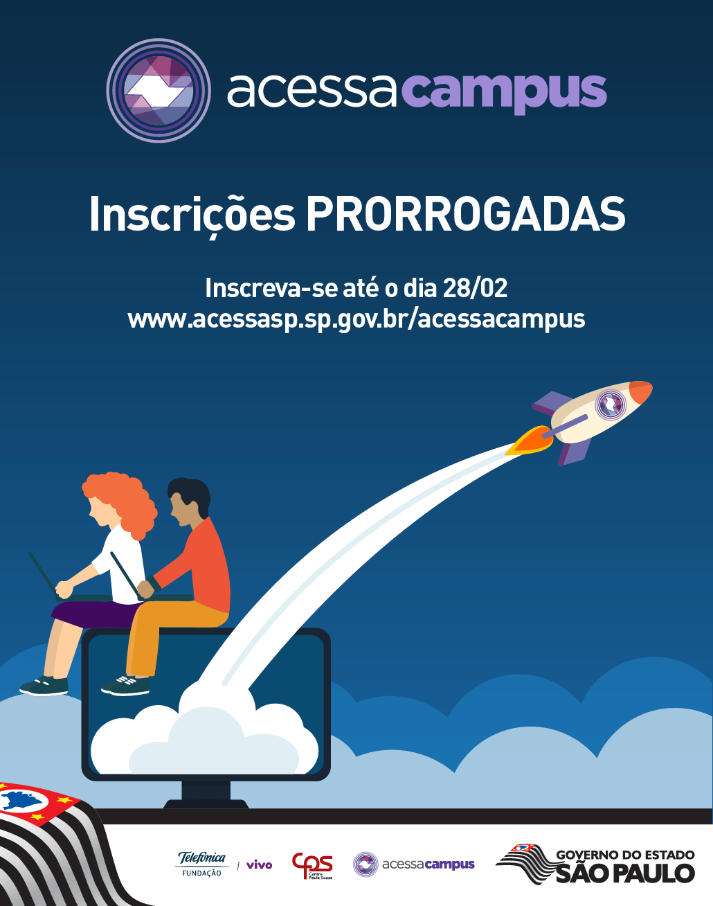 As inscrições para quem quiser participar do Acessa Campus, espaço público para trabalho compartilhado que começará a funcionar na Escola Técnica Estadual (Etec) Parque da Juventude no final de março, foram prorrogadas até o dia 28 de fevereiro, exclusivamente pela internet. Lançado em janeiro, o projeto busca estimular o empreendedorismo paulista com a criação de um coworking com 80 posições disponíveis.