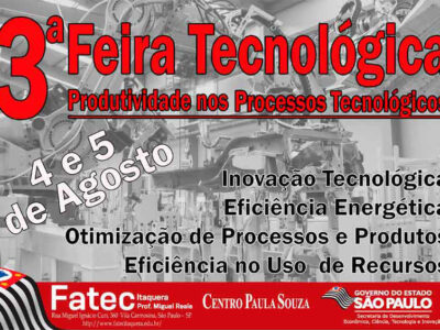 Com o tema Produtividade nos Processos Tecnológicos, a Faculdade de Tecnologia do Estado (Fatec) Prof. Miguel Reale, de Itaquera (Capital), realiza nos dias 4 e 5 de agosto sua 3ª Feira Tecnológica. O evento aberto […]