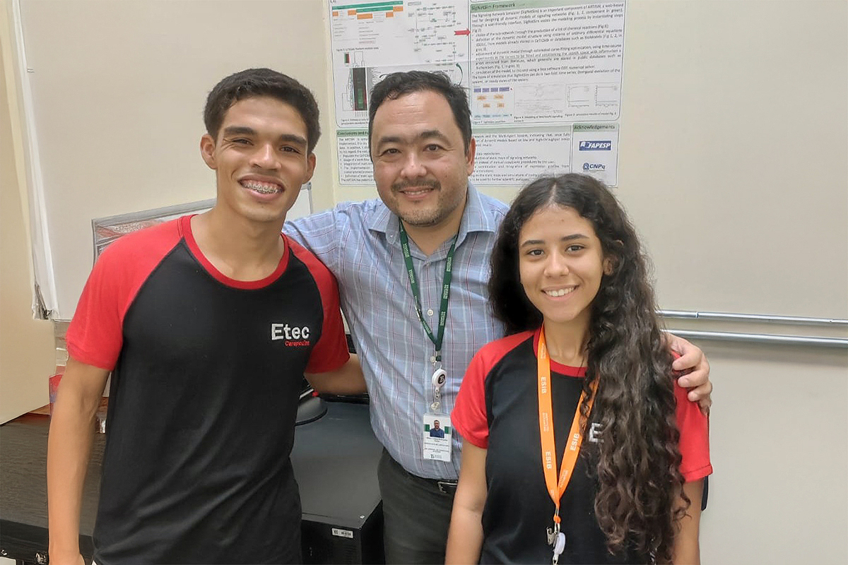 Alunos Kauã e Giovanna com o orientador Milton Nishyiama: mudança no método de avaliação de toxinas | Foto: Divulgação