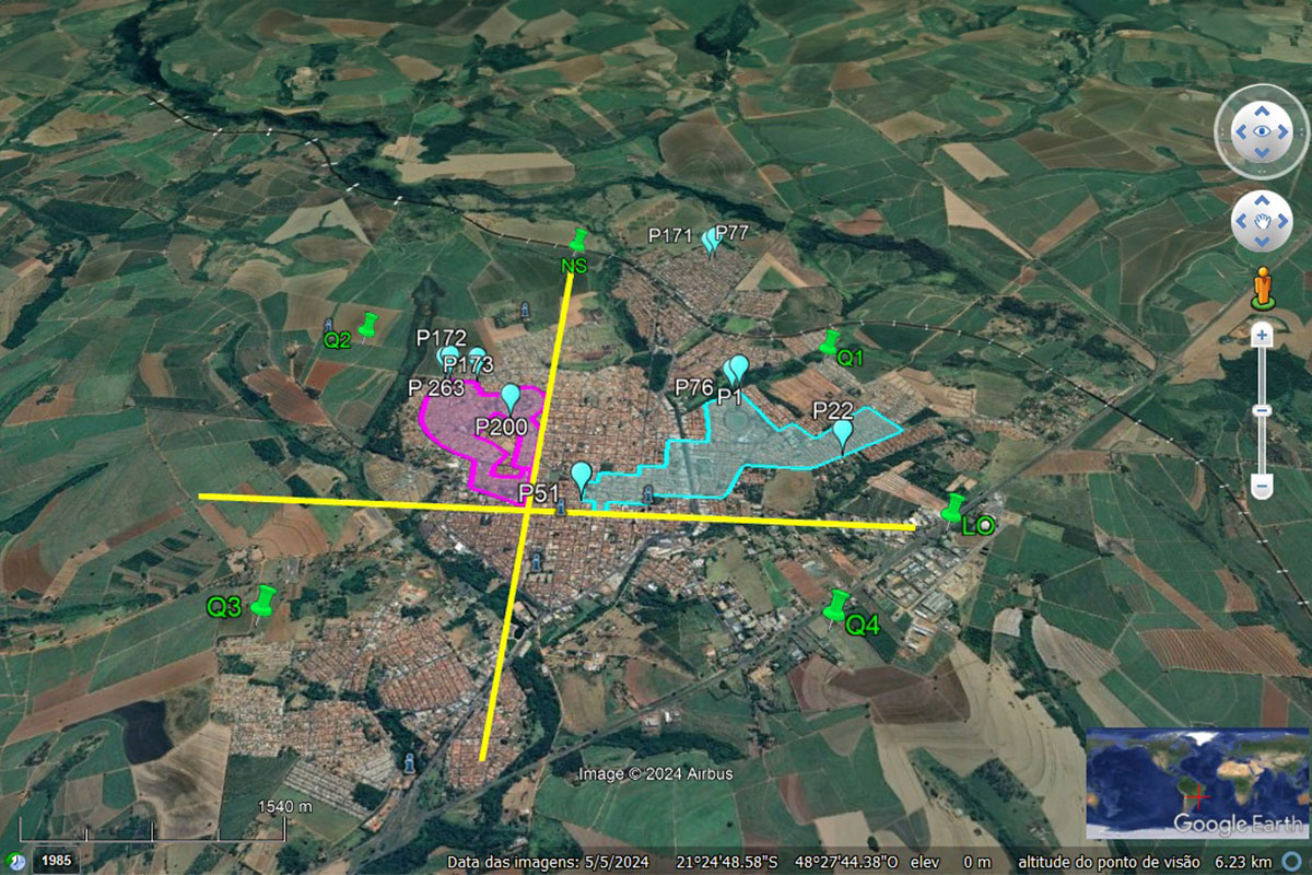 Áreas destacadas em rosa e azul indicam dois dos quatro corredores de acessibilidade propostos na pesquisa l Foto: Google Earth Pro