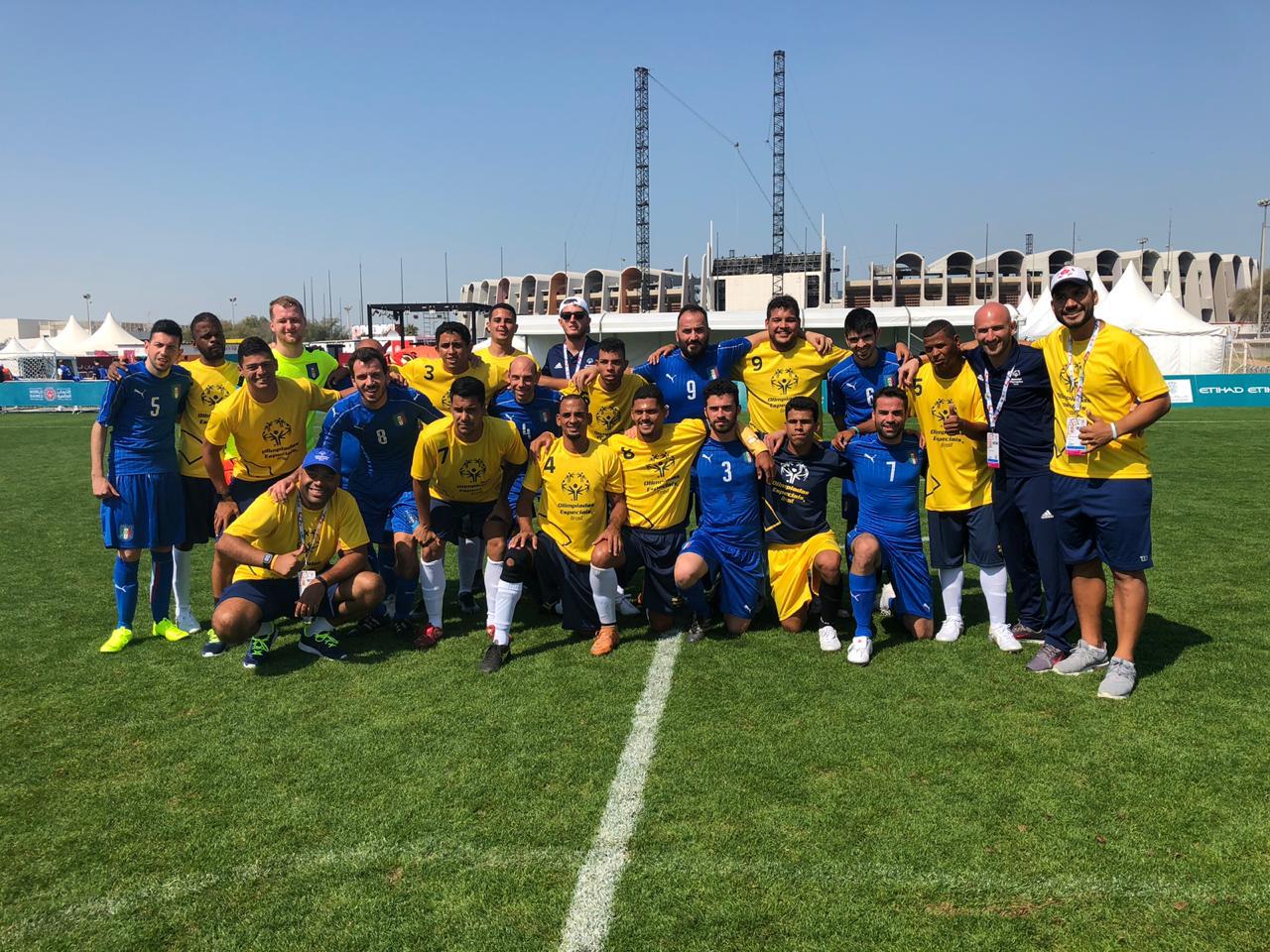 Nos Jogos Mundiais das Olimpíadas Especiais de Abu Dhabi, as partidas de futsal unificado são disputadas na grama l Foto: Divulgação