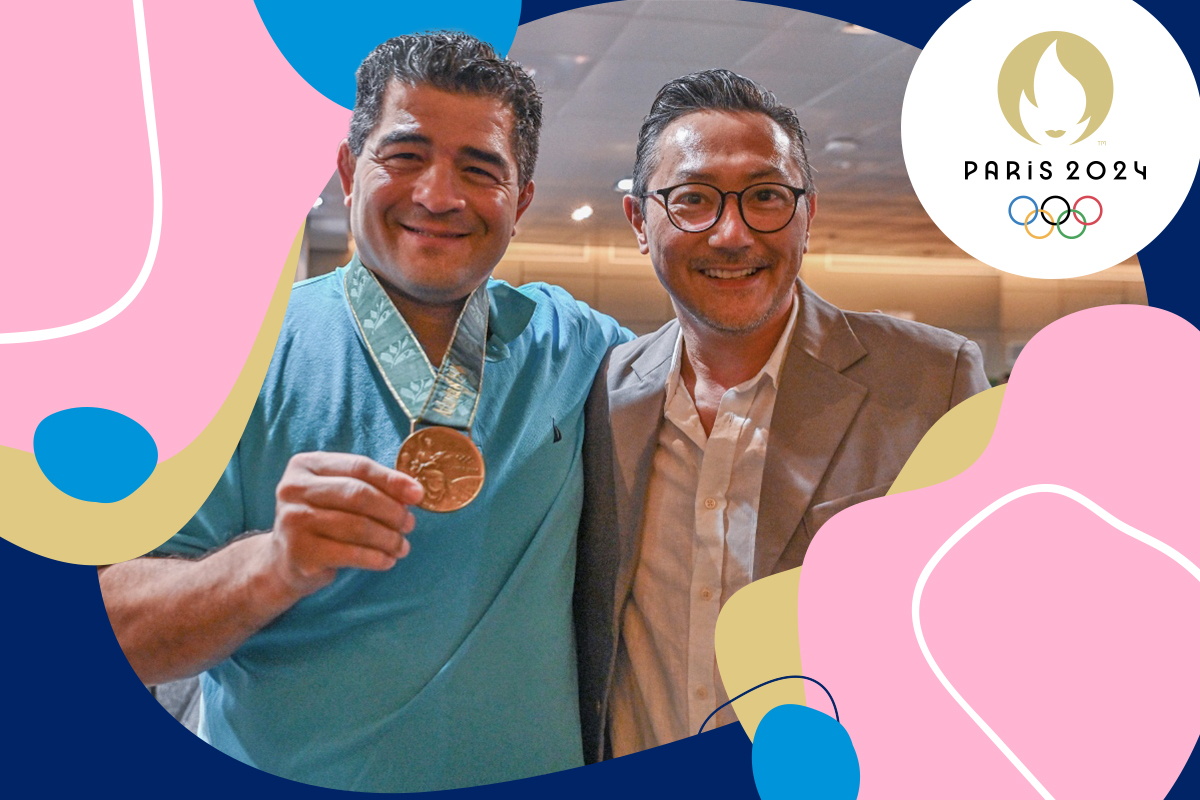 Vinícius Hirota (dir.), durante evento no CPS, ao lado de Henrique Guimarães, medalhista de bronze em Atlanta | Foto: Roberto Sungi