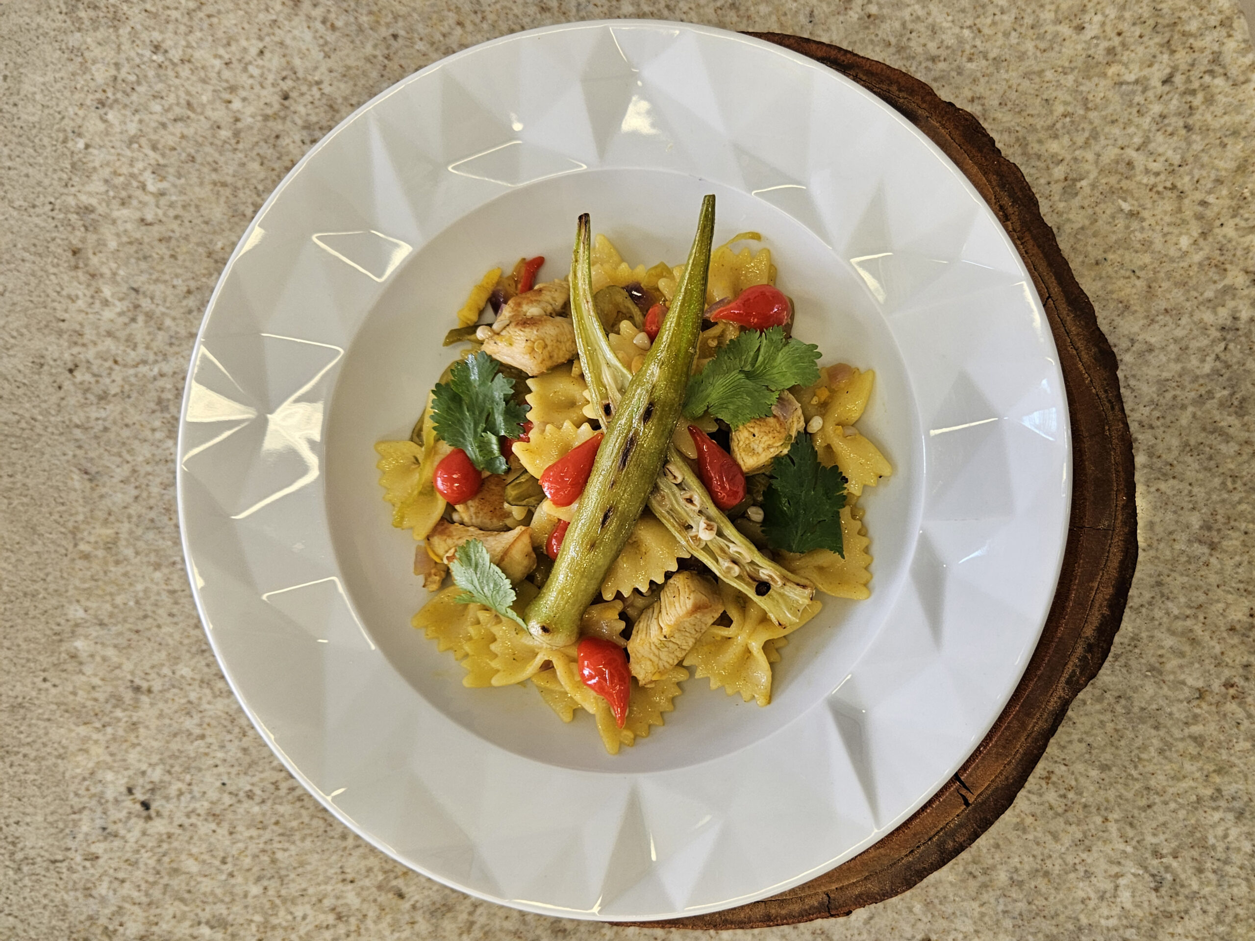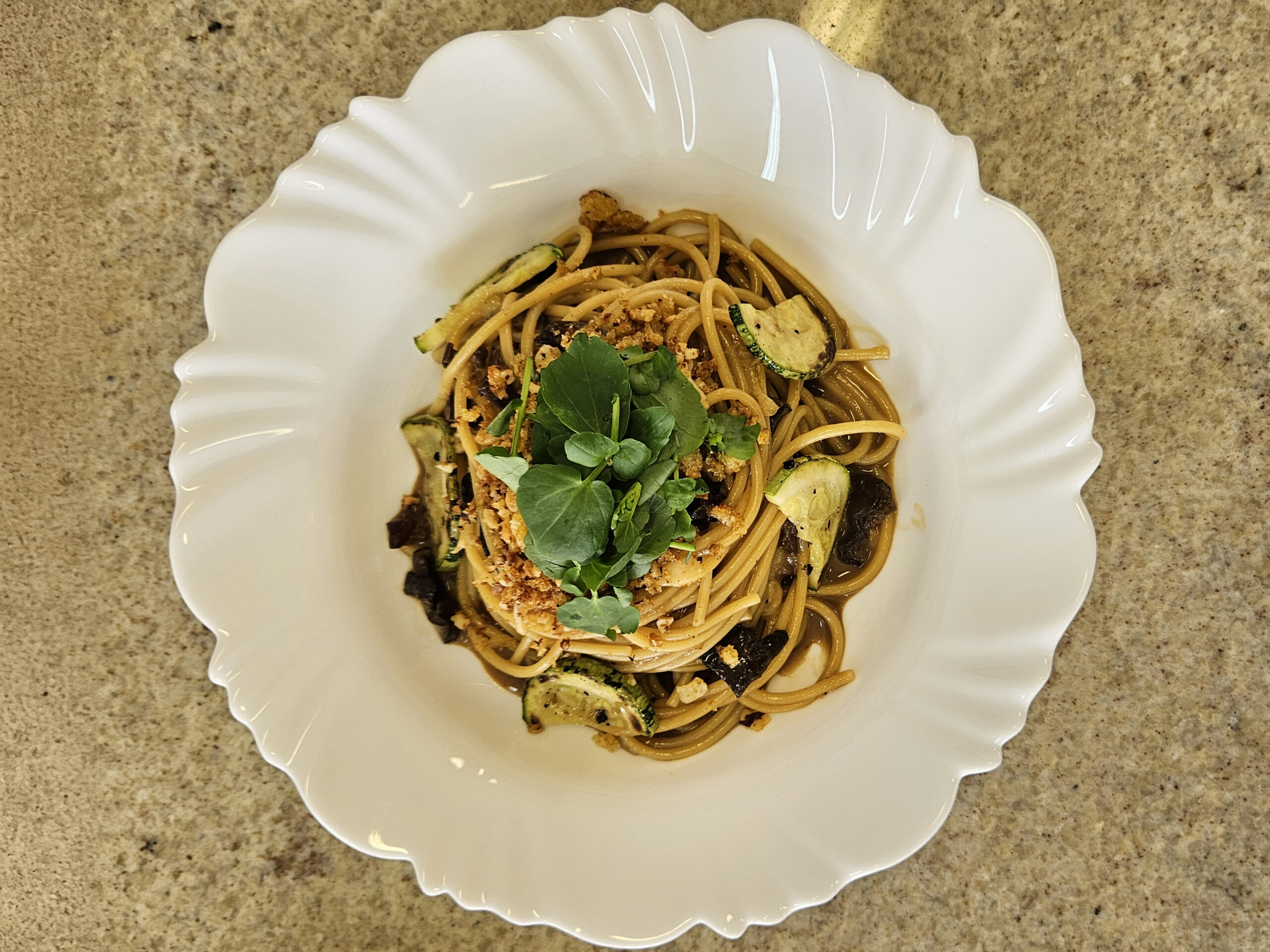 Transfira a massa para um prato, incorpore as abobrinhas grelhadas por volta da massa, e finalize com a farofa de castanhas e os brotos de agrião.