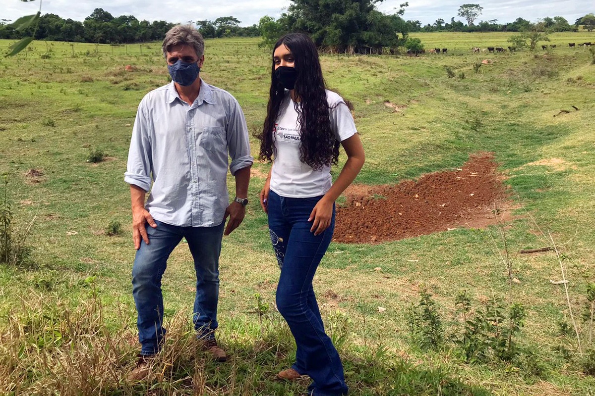 Professor Gilberto Balejo e a estudante Vitória Lima; ao fundo, represa seca por falta de nascentes | Foto: Divulgação