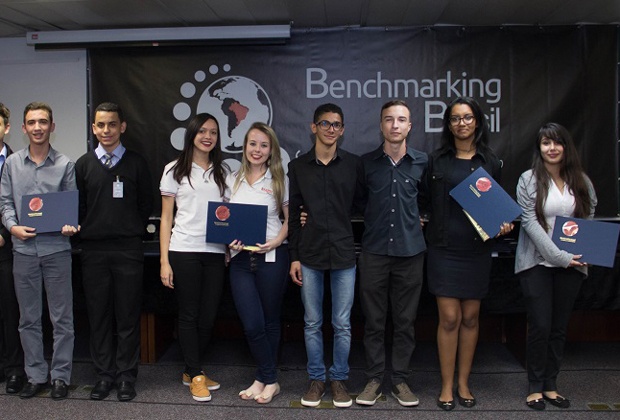 Crédito: Divulgação/Benchmarking | Fernanda, da Etec Getúlio Vargas, e trio da Etec Bento Quirino (da dir. para a esq.) receberam certificados