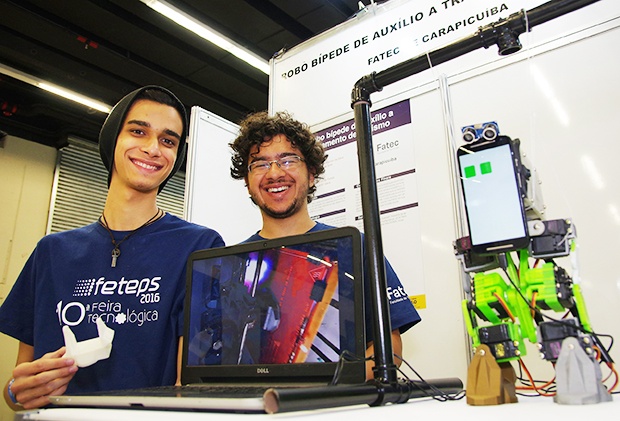 Crédito: Gastão Guedes | Lucas Brito e Wendell Silva durante apresentação do robô bípede na 10ª Feteps
