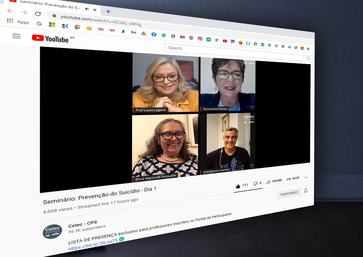 O Centro Paula Souza (CPS) iniciou ontem a primeira edição do Seminário de Prevenção ao Suicídio. O evento online continua nesta quinta-feira (16), com temas para reflexão sobre o Setembro Amarelo e a importância da valorização da vida. Voltado à comunidade das Escolas Técnicas (Etecs) e Faculdades de Tecnologia (Fatecs) estaduais, além de qualquer pessoa interessada, o encontro traz palestras com especialistas sobre cuidados consigo e com os outros, saúde mental e perigos do comportamento suicida. A transmissão do segundo dia de palestras começa às 19 horas e será feita pelo canal da Unidade do Ensino Médio e Técnico (Cetec) no Youtube.