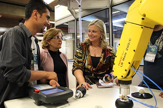 Laura Laganá (à direita), acompanhada pela coordenadora geral do Congresso, Maria da Graça Marcatto, visita estande em que o aluno da Fatec São Paulo, Jonny Dreger, apresenta um equipamento utilizado no laboratório de robótica. / Robsoñ Luquêsi.