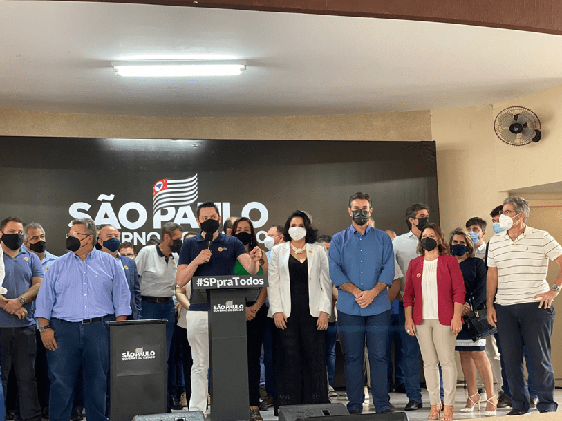 Emilena Lorenzon (de blazer vermelho) ao lado de Rodrigo Garcia durante anúncio dos investimentos | Foto: Divulgação